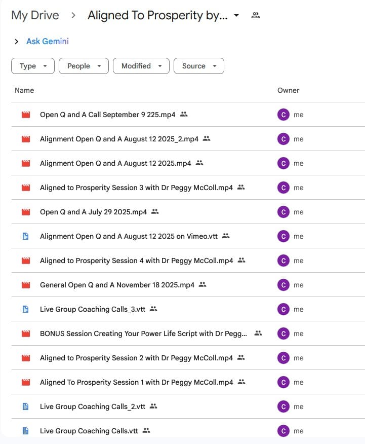 Aligned To Prosperity is a 30-day prosperity alignment program by Dr. Peggy McColl, New York Times bestselling author and founder of Dynamic Destinies, Inc. The program combines 4 core instructional classes with live group coaching calls, daily guided practices, and subconscious reprogramming techniques built on McColl's proprietary Power Life Script and Discovery Unlocked methods. Includes 12 video lessons, 3 downloadable PDFs, 1 audio file, and over 7 hours 58 minutes of content totaling 3.38 GB.