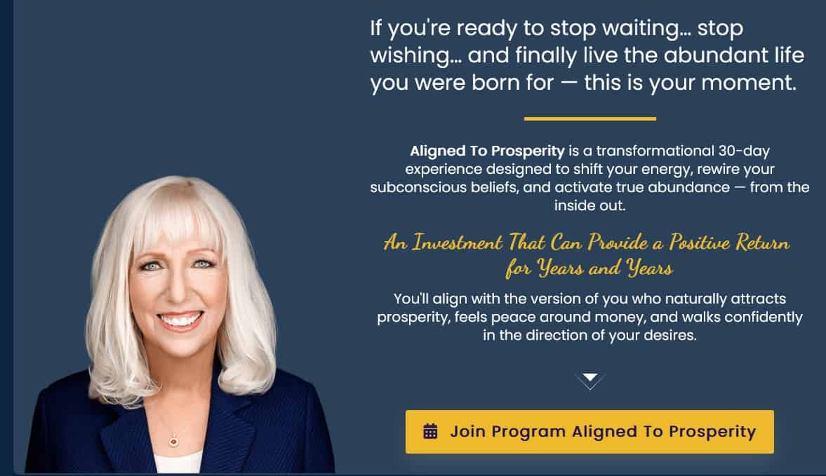 Aligned To Prosperity is a 30-day prosperity alignment program by Dr. Peggy McColl that combines instructional video classes, daily guided practices, and subconscious reprogramming techniques. The program uses McColl's Power Life Script and Discovery Unlocked methods to shift participants from scarcity-based thinking to sustained abundance alignment across identity, energy, beliefs, and actions.