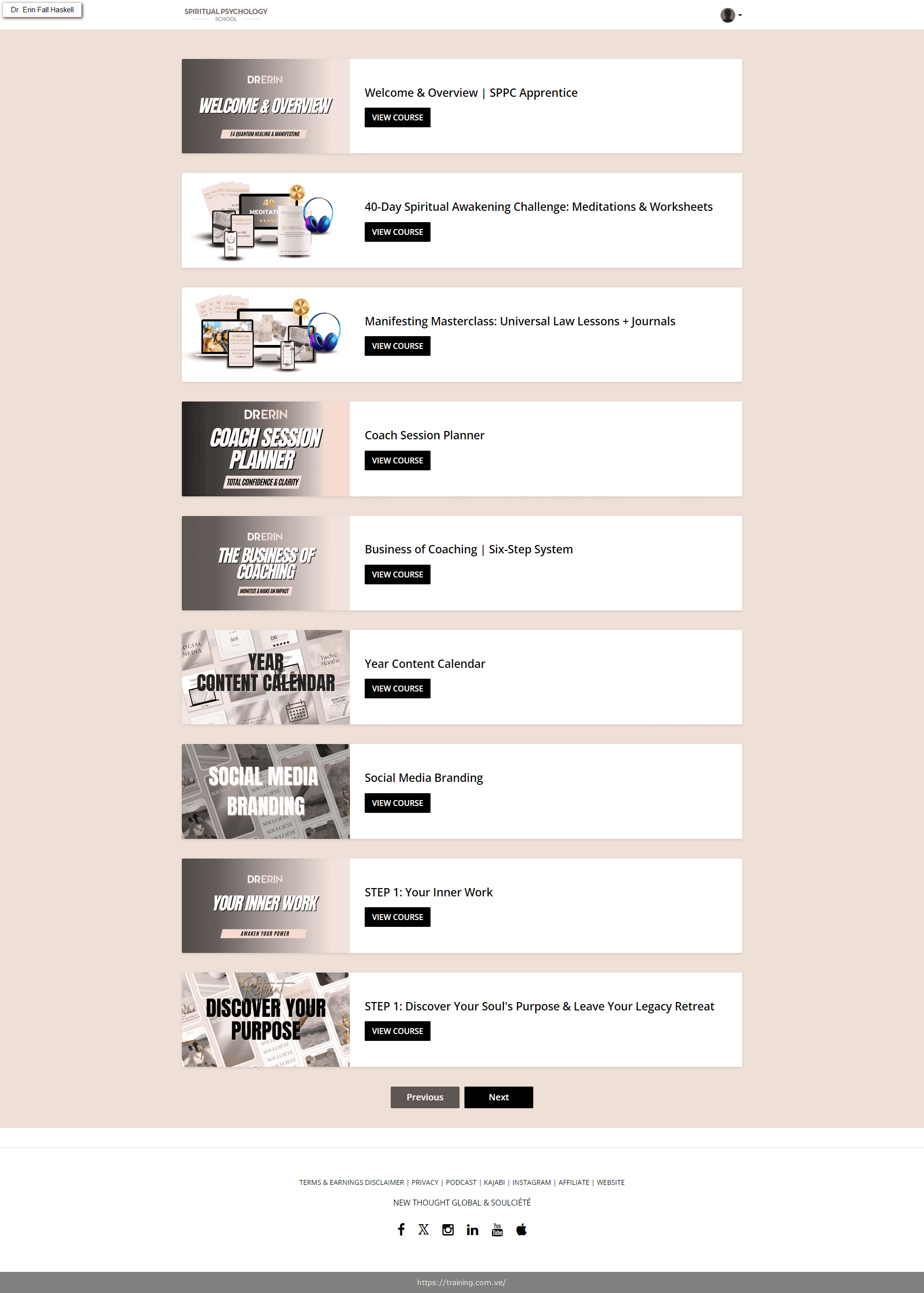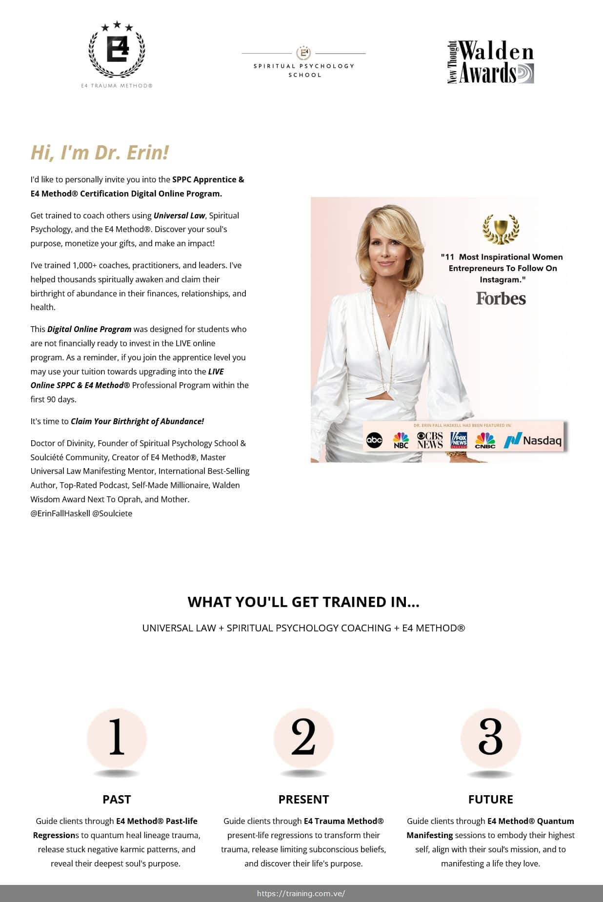 Dr. Erin Fall Haskell, a Doctor of Divinity from the Emerson Theological Institute, created this program. She is the founder of Spiritual Psychology School and the Soulciete community, received the 2020 Walden Wisdom Award (alongside Oprah Winfrey), and is the author of the international best-seller “Awakening.” She has trained over 1,000 coaches and practitioners.