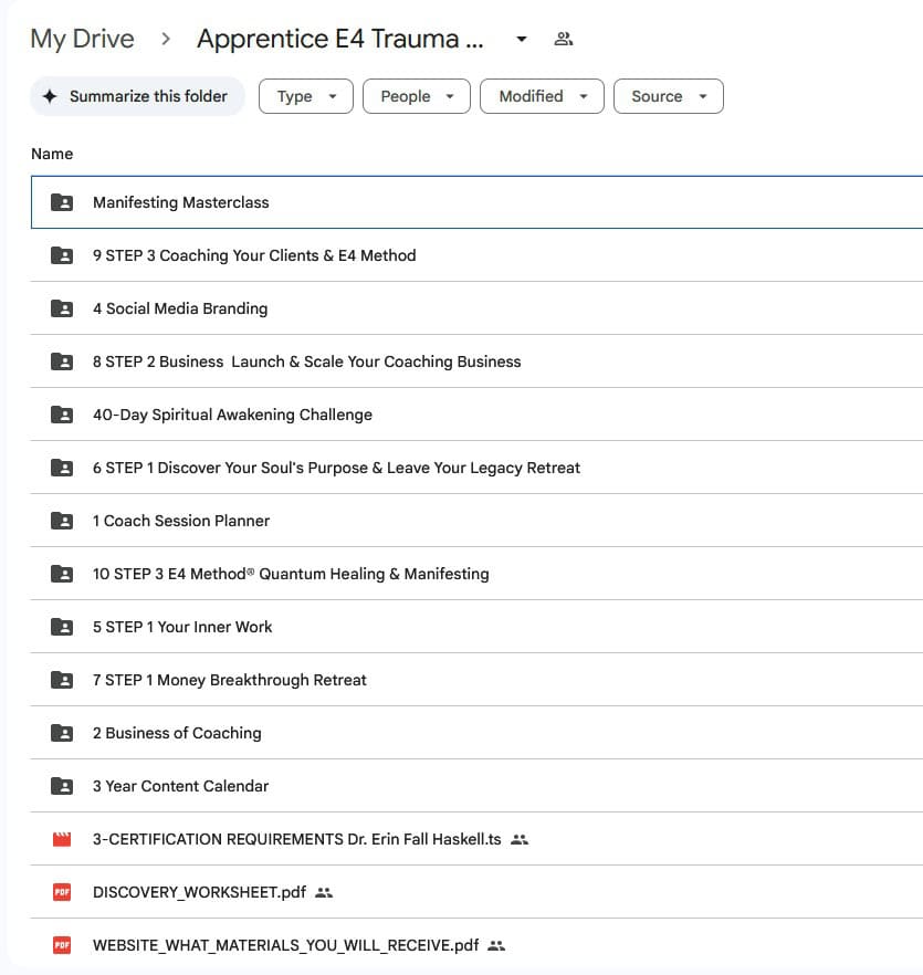 Apprentice E4 Trauma Method is a comprehensive Spiritual Psychology Practitioner Coach (SPPC) and E4 Method certification program created by Dr. Erin Fall Haskell, a Doctor of Divinity and founder of Spiritual Psychology School and the Soulciete community. The program trains practitioners in Universal Law, Spiritual Psychology coaching, and the proprietary E4 Trauma Method — a modality for quantum healing past-life and present-life trauma, releasing limiting subconscious beliefs, and facilitating soul retrieval. This digital training includes 459 video lessons, 440 PDF resources, and over 212 hours of content totaling 74.13 GB.