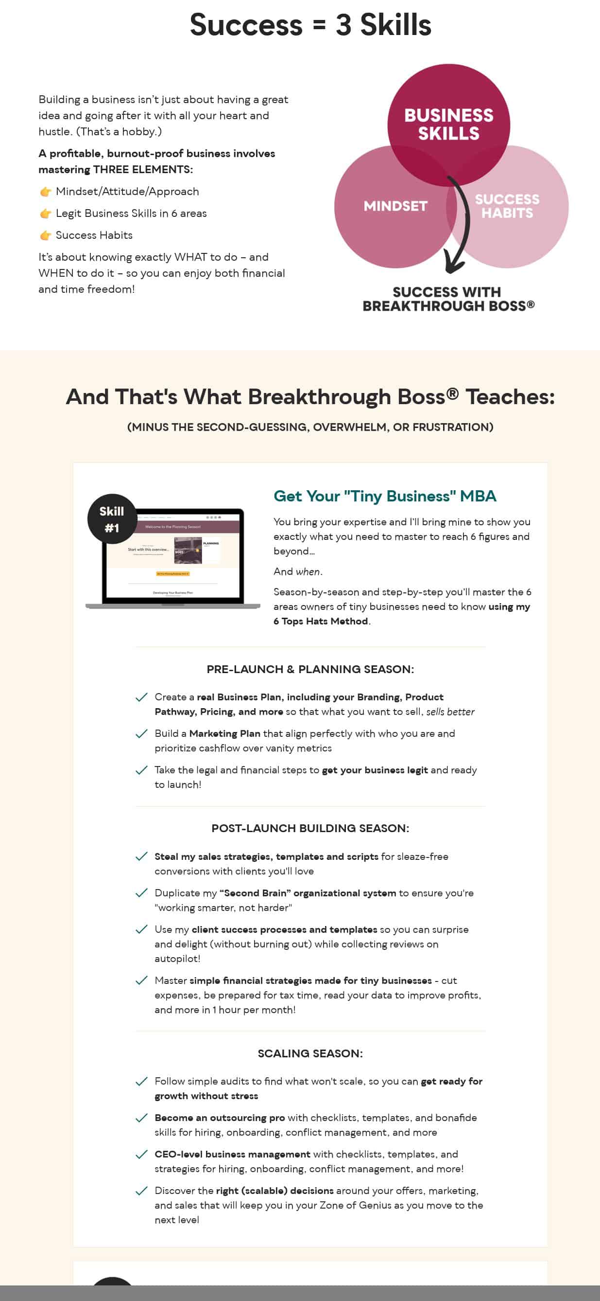Breakthrough Boss is a comprehensive business and mindset program for solopreneurs and micro-business owners. Created by Tara Wagner, it covers the full business lifecycle — from audience identification and offer creation through sales, operations, hiring, and scaling — while simultaneously addressing the limiting beliefs, habits, and identity shifts that determine whether those business strategies actually get implemented.
