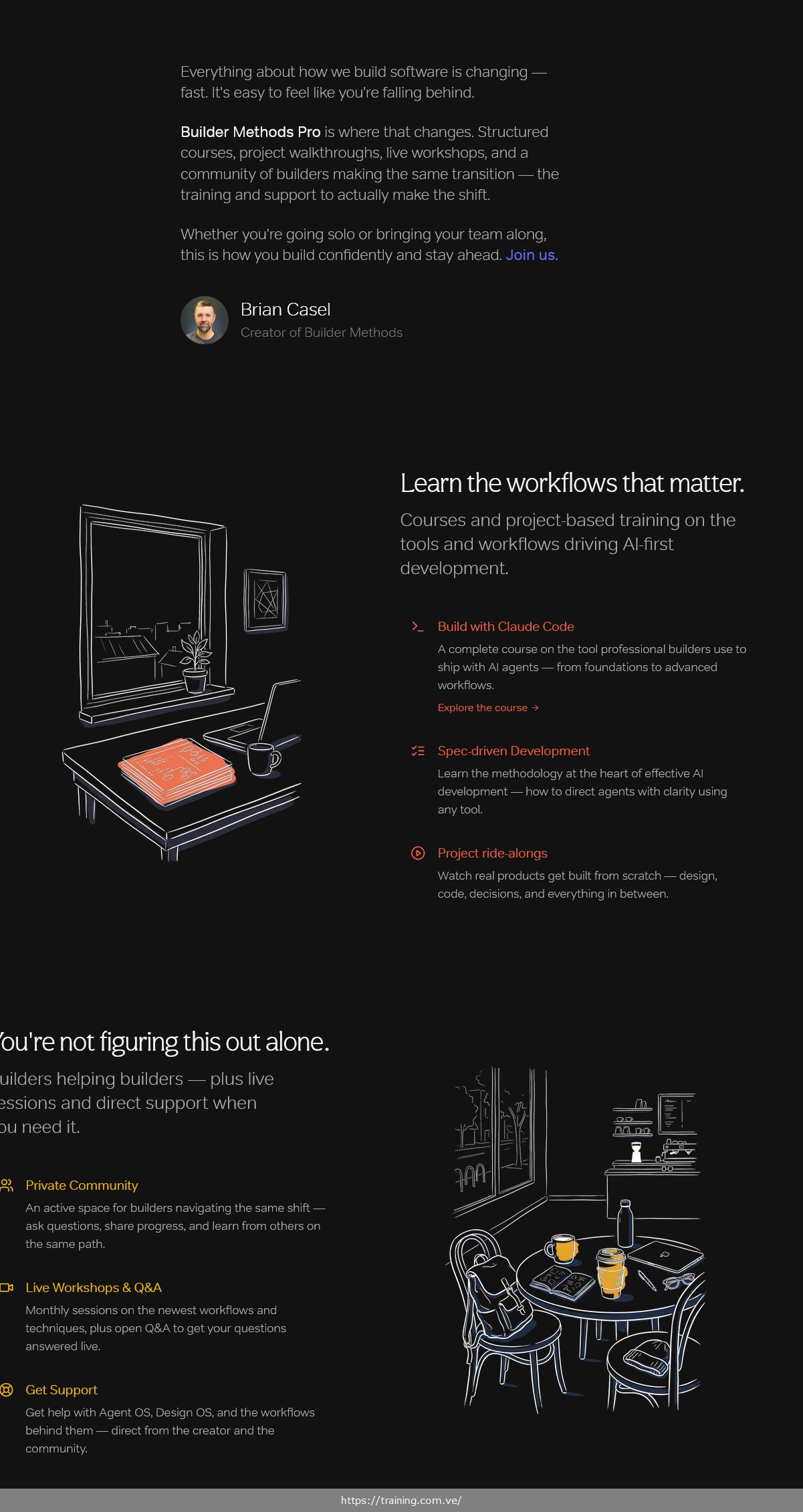 Builder Methods Pro is a video training membership for developers and founders making the shift to AI-first software development. The curriculum covers Claude Code setup, Spec-Driven Development, autonomous agent systems (including multi-agent workflows), the Agent OS and Design OS frameworks, and project ride-alongs showing complete feature builds from specification through implementation.