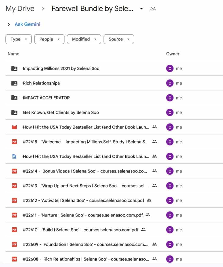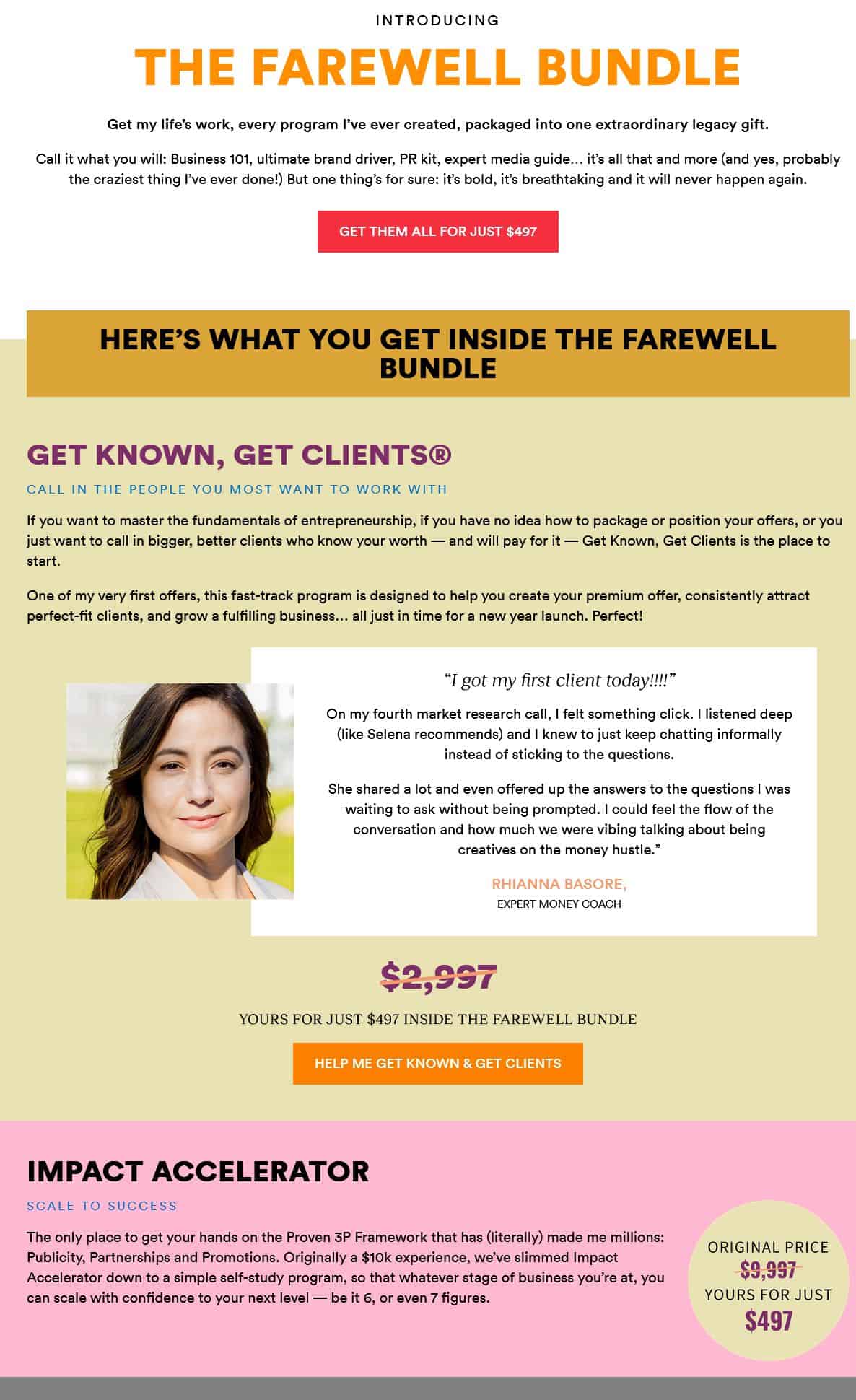 The Farewell Bundle is a complete collection of Selena Soo's four major programs: Get Known, Get Clients (client acquisition and business fundamentals), Impacting Millions 2021 (publicity and media strategy), Impact Accelerator (advanced business coaching), and Rich Relationships (strategic relationship-building). Originally priced at $497, the bundle represents Selena Soo's entire body of work in publicity, marketing strategy, and relationship-driven business growth.