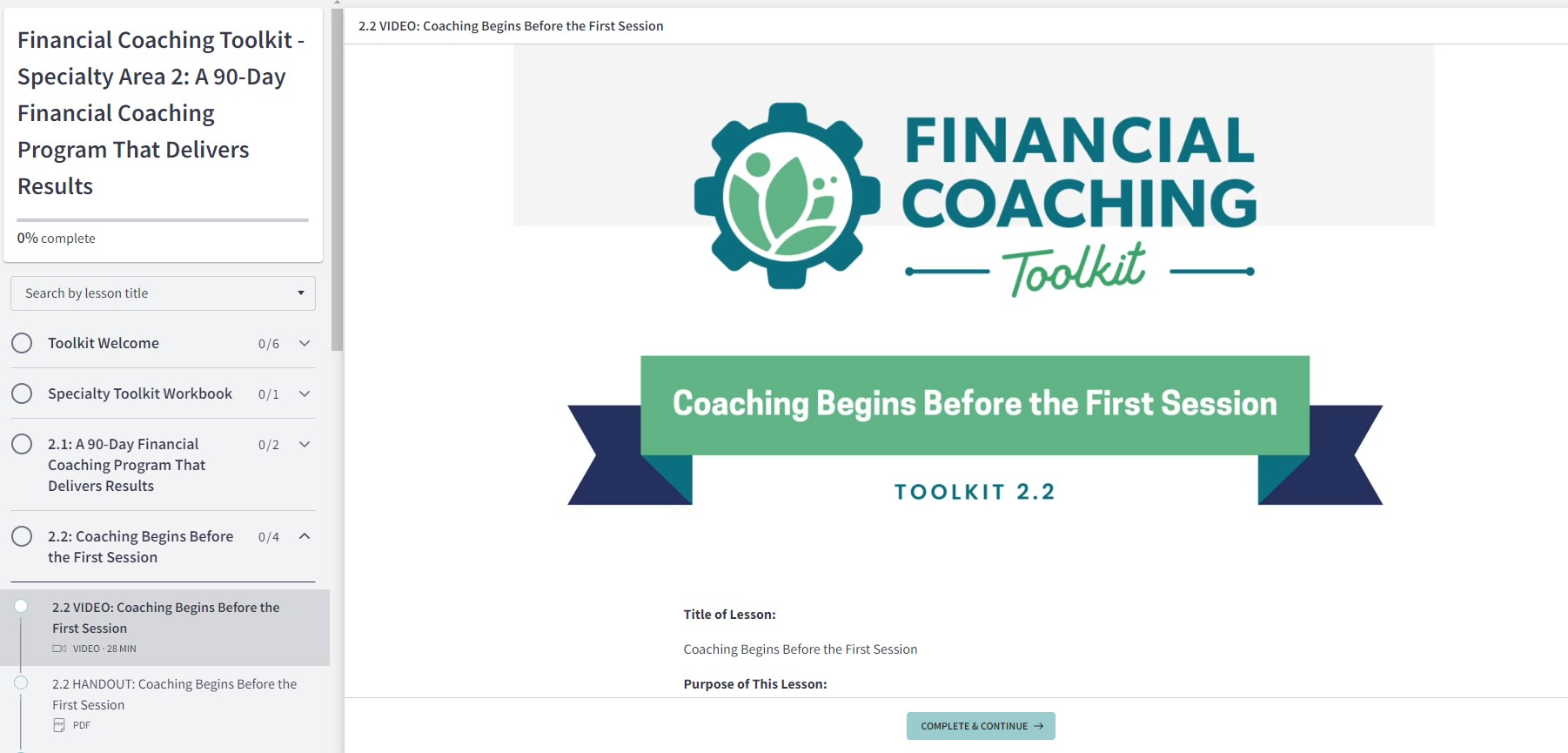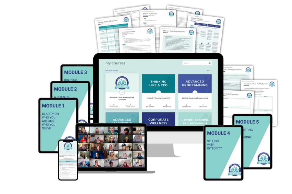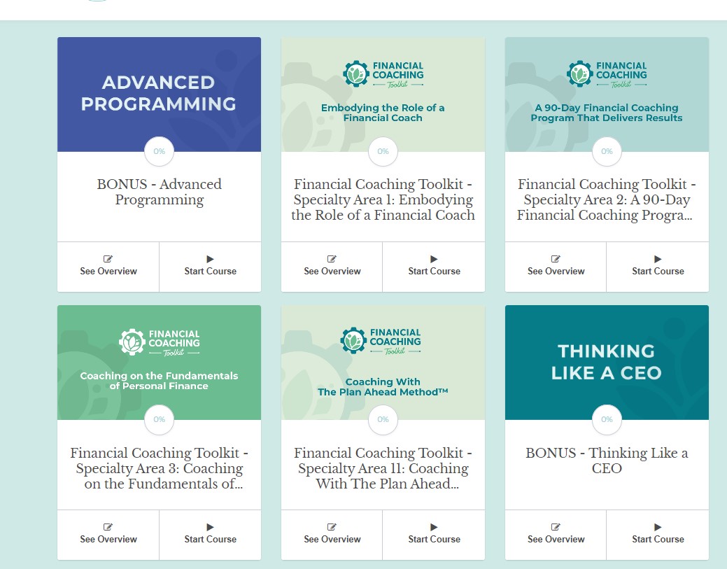 You'll learn how to build a 90-day financial coaching program using the Client Journey Framework, master the Plan Ahead Method budgeting system, coach on financial fundamentals using 100+ client worksheets, develop corporate wellness programs for employers, create onboarding systems that convert discovery sessions, sell coaching services using objection-handling scripts, build referral networks with financial professionals, design marketing resources and social media content, and establish legal protections and business structure specific to financial coaching.