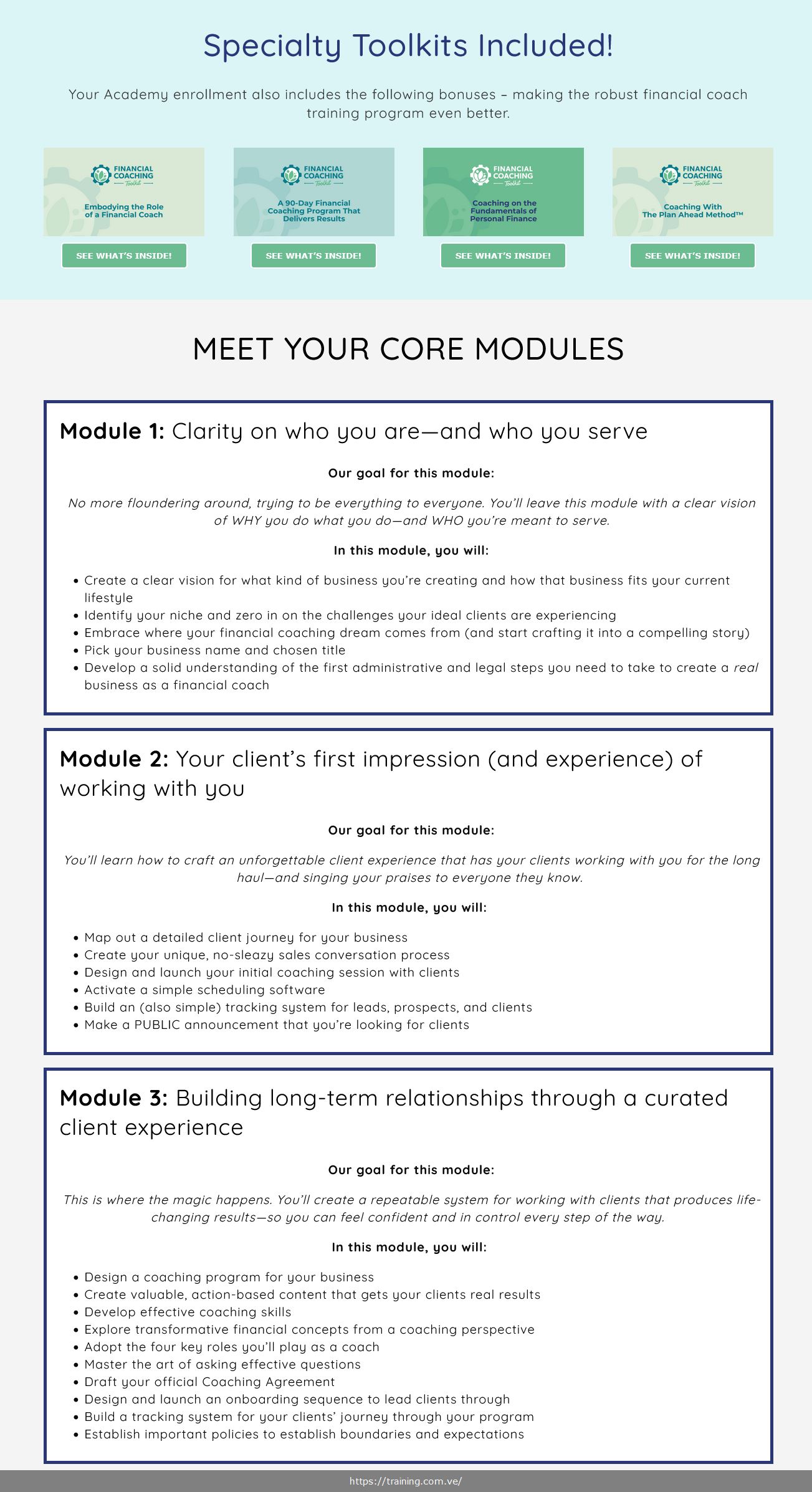 • 📕 Resources: Design Your Coaching Program, Four Key Roles of a Financial Coach, Client Exercise Ideation, The Ripple Effect, Coaching Program Flier, Money Skills Tracker, Content Creation Framework, Effective Coaching Questions, Identifying Your Three Values, Content Library Spreadsheet, Six Month Coaching Agreement, Welcome to Coaching Email, Coaching Session Emails, Client Income Tracker, Client Session Tracker, Testimonial Release Form, Module 3 Rubric