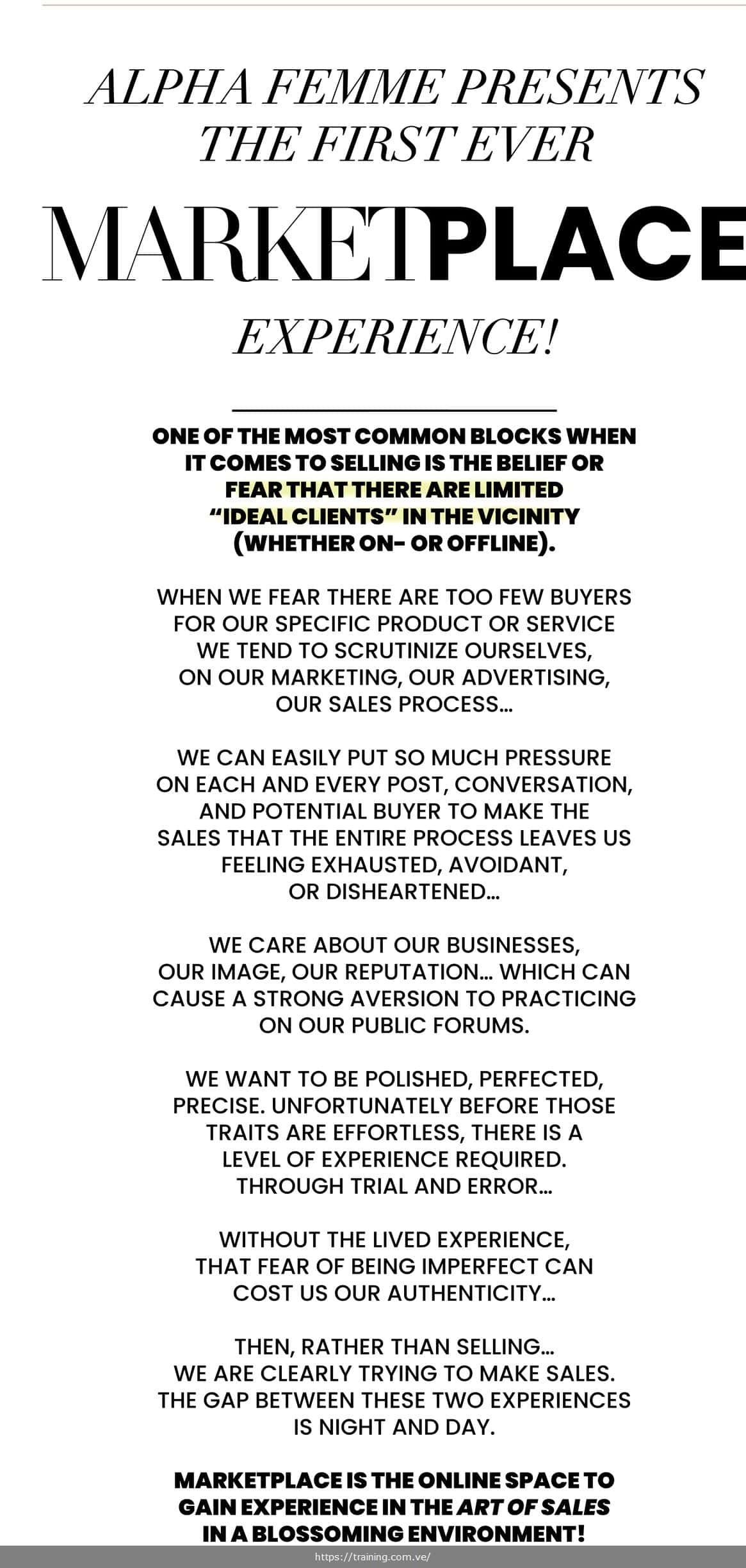 - The Coach Overthinking Every Sales Approach — You research sales strategies, consume content about funnels and frameworks, but freeze when it comes to actually making offers. Marketplace provides a structured yet supportive environment to practice selling in real time with live coaching sessions where you can test your offers and receive immediate feedback.