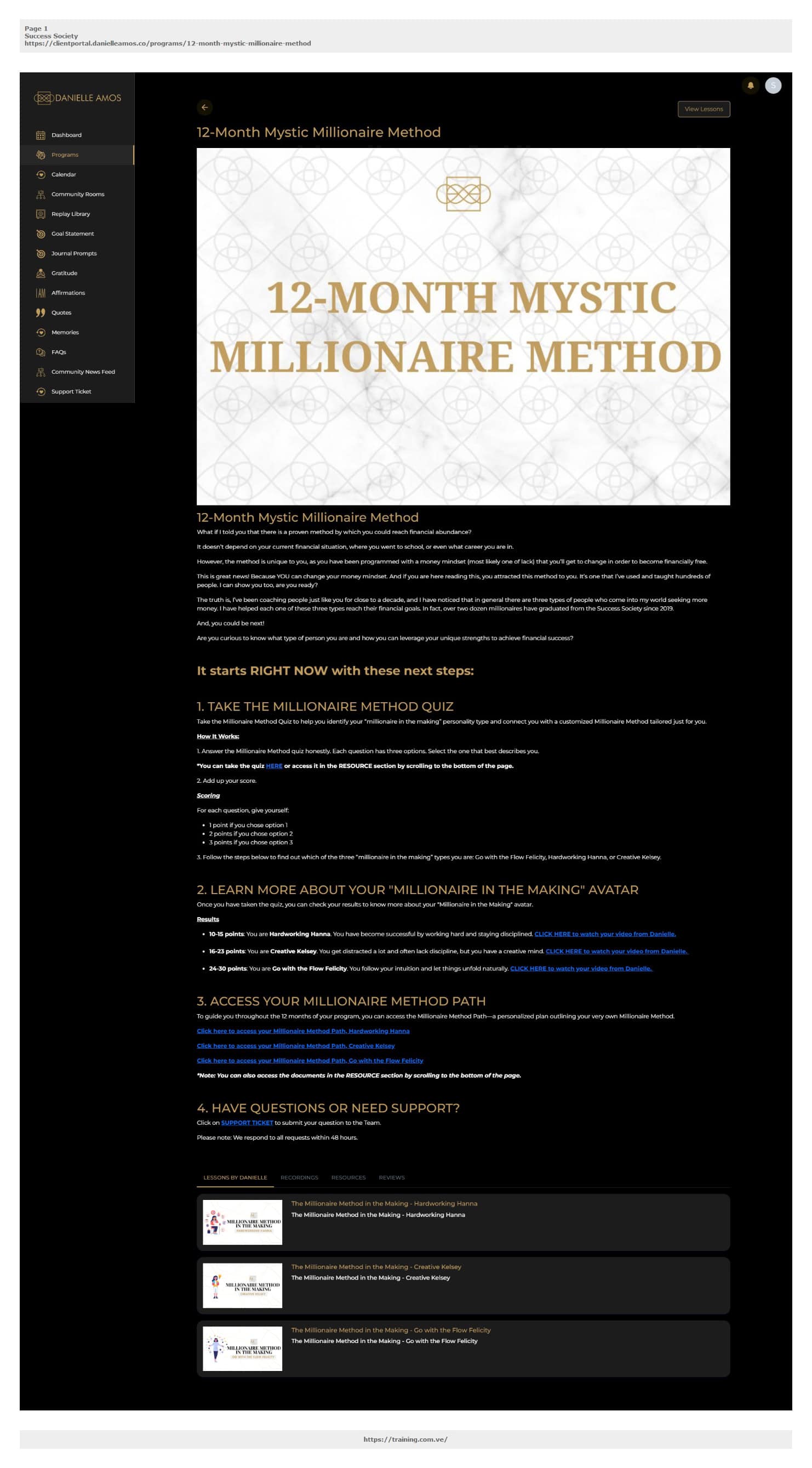 The Millionaire Code Identity Architecture — Take the Millionaire Method Quiz to identify your wealth personality type (Creative Kelsey, Go with the Flow Felicity, or Hardworking Hanna) and receive customized strategies for your specific money blueprint.