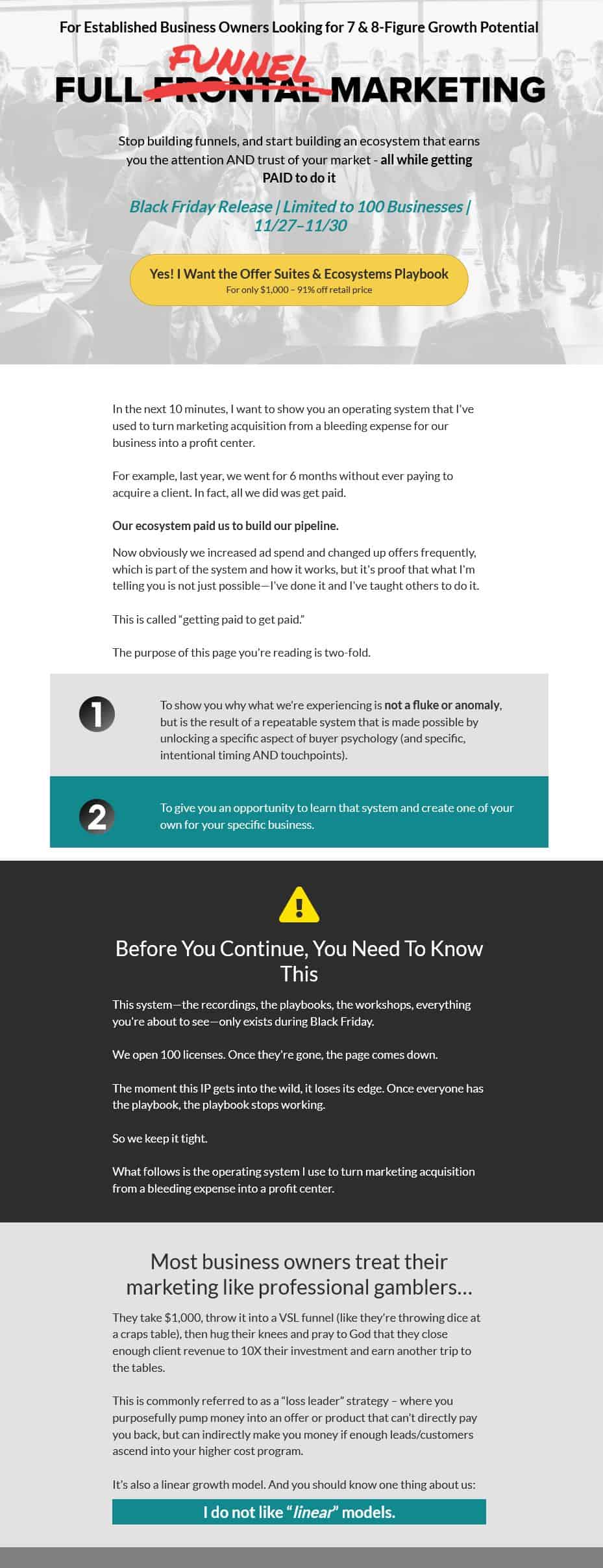 Unlike courses teaching isolated webinar or challenge funnels, Offer Suites & Ecosystems focuses on ecosystem architecture where multiple offers work together to create retention-based revenue. The program applies neurological research on dopamine conditioning, endowment effect, and goal gradient theory to product design rather than generic persuasion tactics. It provides specific financial models for profitability analysis and introduces the Pamphlet Power methodology for ultra-low-ticket authority products that serve as both lead generation and profit centers. The Ten Mechanism Frameworks systematize positioning creativity rather than offering vague advice to “find your unique angle.”