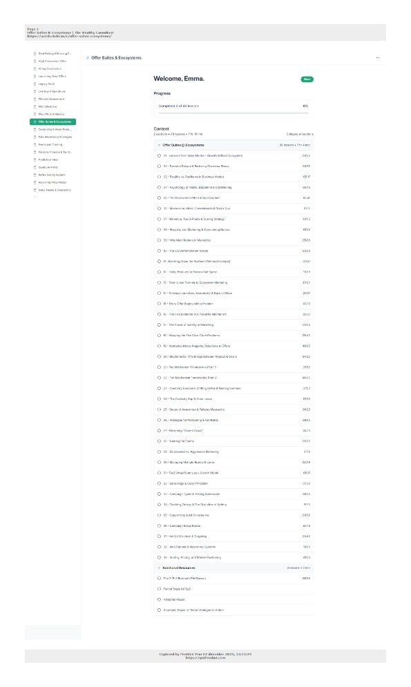 - The Agency Owner Dependent on One Traffic Source — You're running Facebook ads or referrals exclusively, and when that channel wobbles, revenue crashes. The From Linear Funnels to Ecosystem Marketing lesson teaches resilience-based business architecture where multiple offers, channels, and touchpoints create anti-fragile revenue systems.