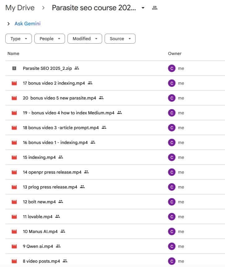 Parasite SEO Course 2025 follows a flat structure with 20 video lessons and 1 resource archive, progressing from platform selection through AI content creation to advanced indexing techniques.