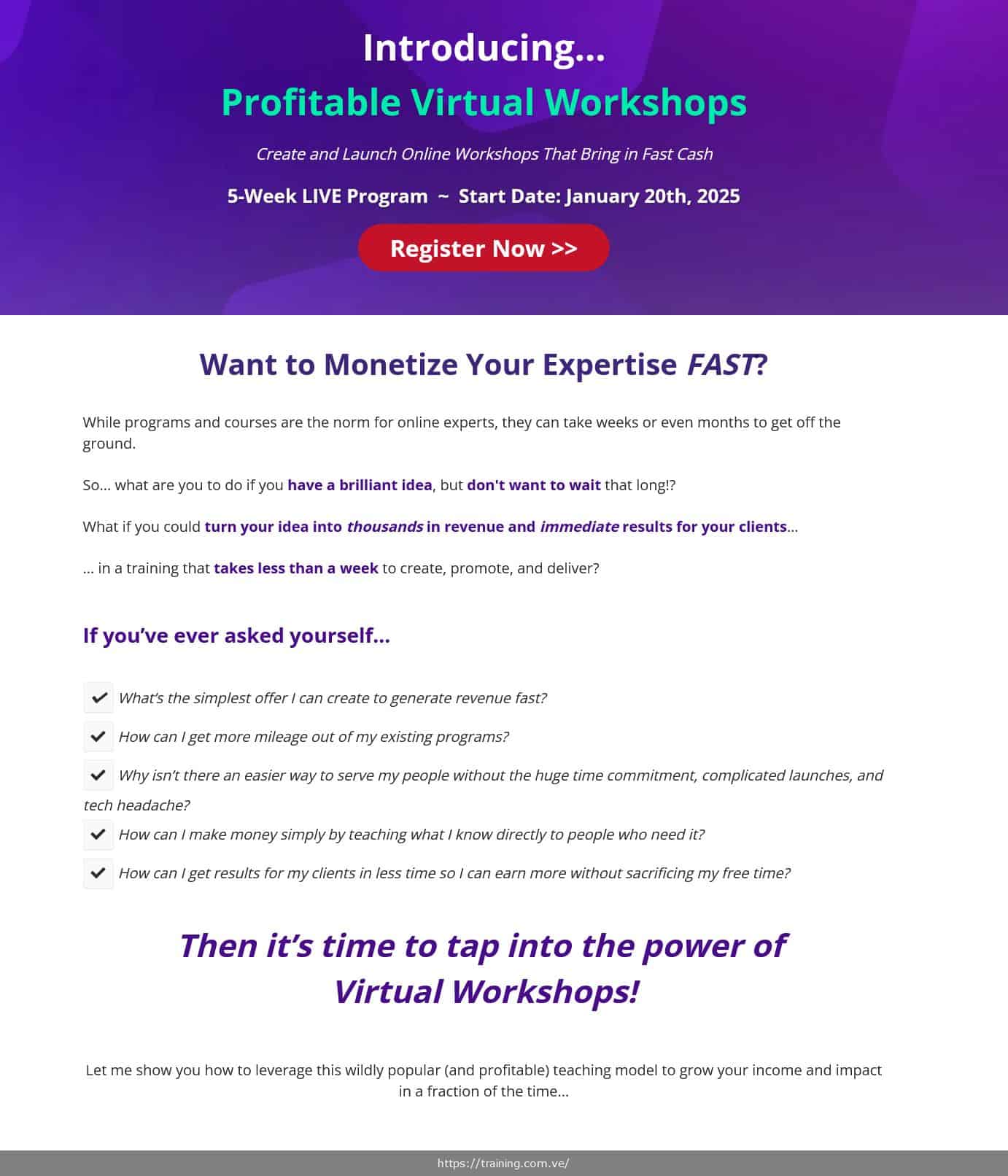 - The Program Creator Ready to Scale — You've successfully sold online programs but want a faster way to generate revenue and build your audience. You know workshops can work but don't have a proven system for filling them or converting attendees into buyers. This program provides the complete promotional blueprint, from email templates to social media posts, plus the workshop-to-offer conversion strategy that turns a 4-hour event into a multi-thousand dollar opportunity.