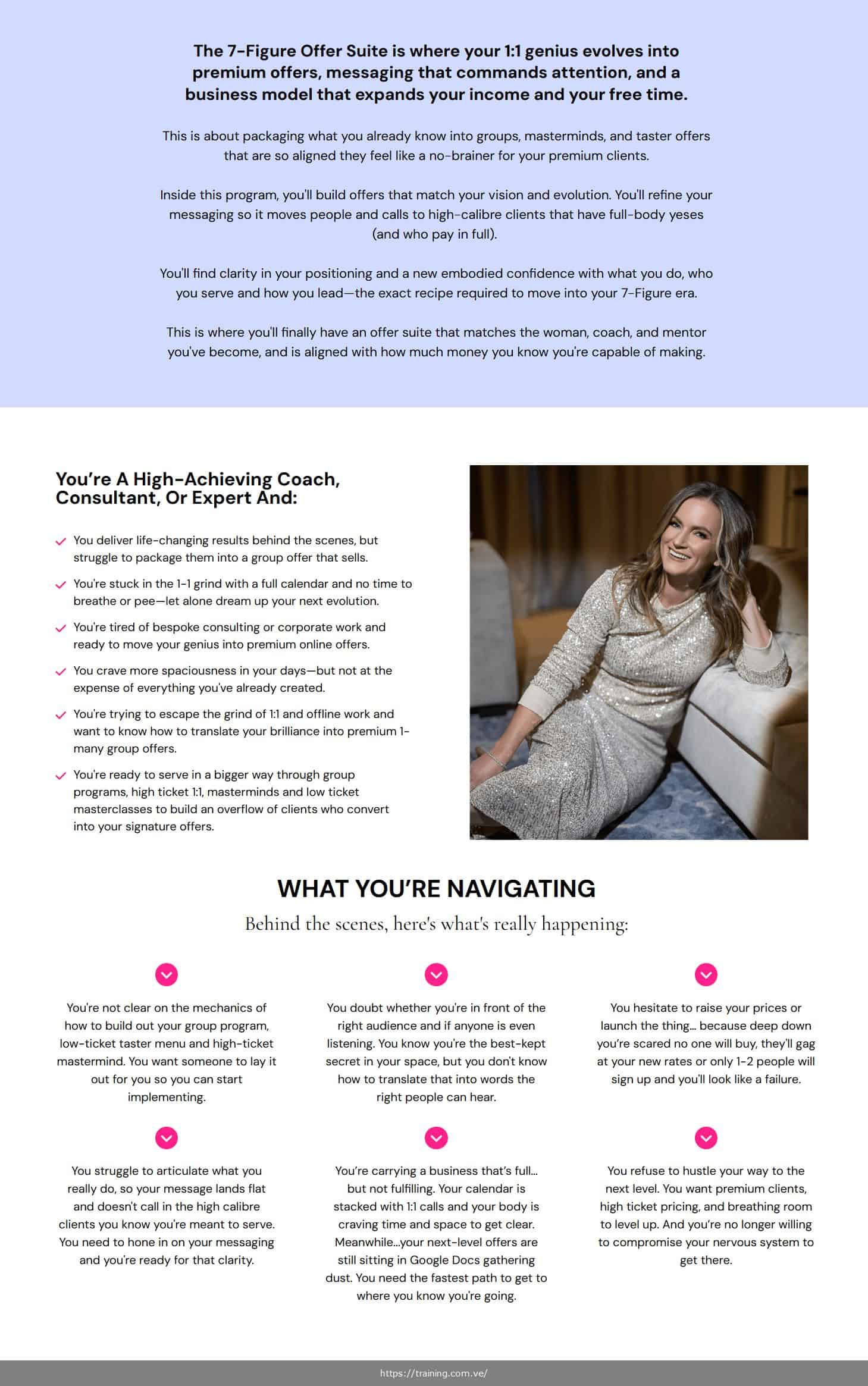 The program suits established coaches stuck at $8K-$15K monthly revenue who need scalability beyond 1-on-1 work, talented practitioners who struggle to articulate their unique value in ways that justify premium pricing, and multi-passionate experts with scattered services who need offer suite architecture. It also serves coaches uncomfortable with traditional sales who want aligned enrollment approaches.