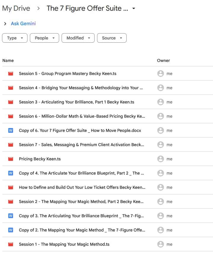 The 7 Figure Offer Suite is a 7-session video training by Becky Keen, a Master Certified Life and Business Coach who has built multiple six-figure businesses and serves 1,000+ coaching clients. The program teaches the Mapping Your Magic Method and the Articulate Your Brilliance Blueprint to design premium offer suites that scale coaching businesses to seven figures. Includes 10 video lessons totaling 10 hours 2 minutes 18 seconds, 19 PDFs, and 5 documents totaling 4.73 GB.