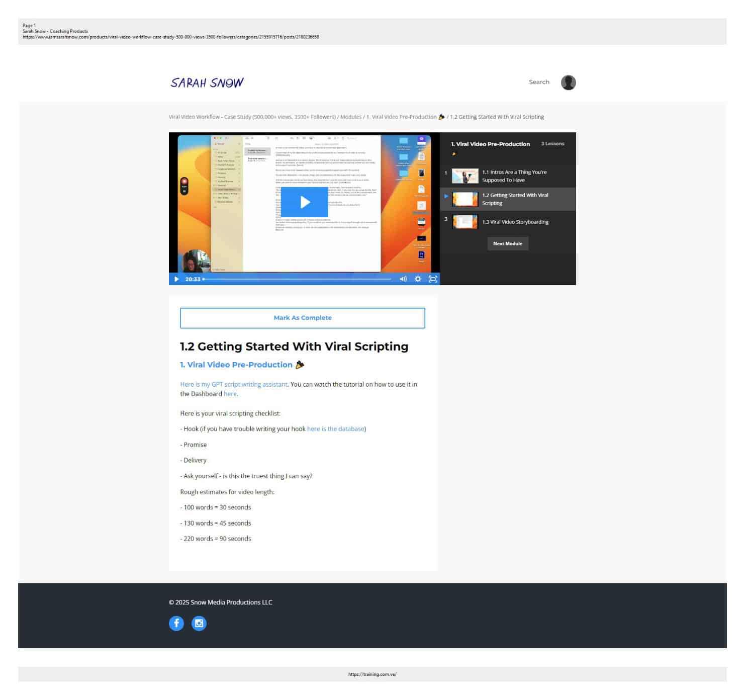 Viral Video Workflow is a 20-lesson video training program teaching Sarah Snow's complete production methodology for creating viral social media content. The course covers scripting, storyboarding, lighting, filming, editing workflow, sound design, color correction, caption integration, thumbnail design, and Instagram optimization—the exact system Sarah Snow developed while producing content that generated over 1 billion views for creators like Jay Shetty.