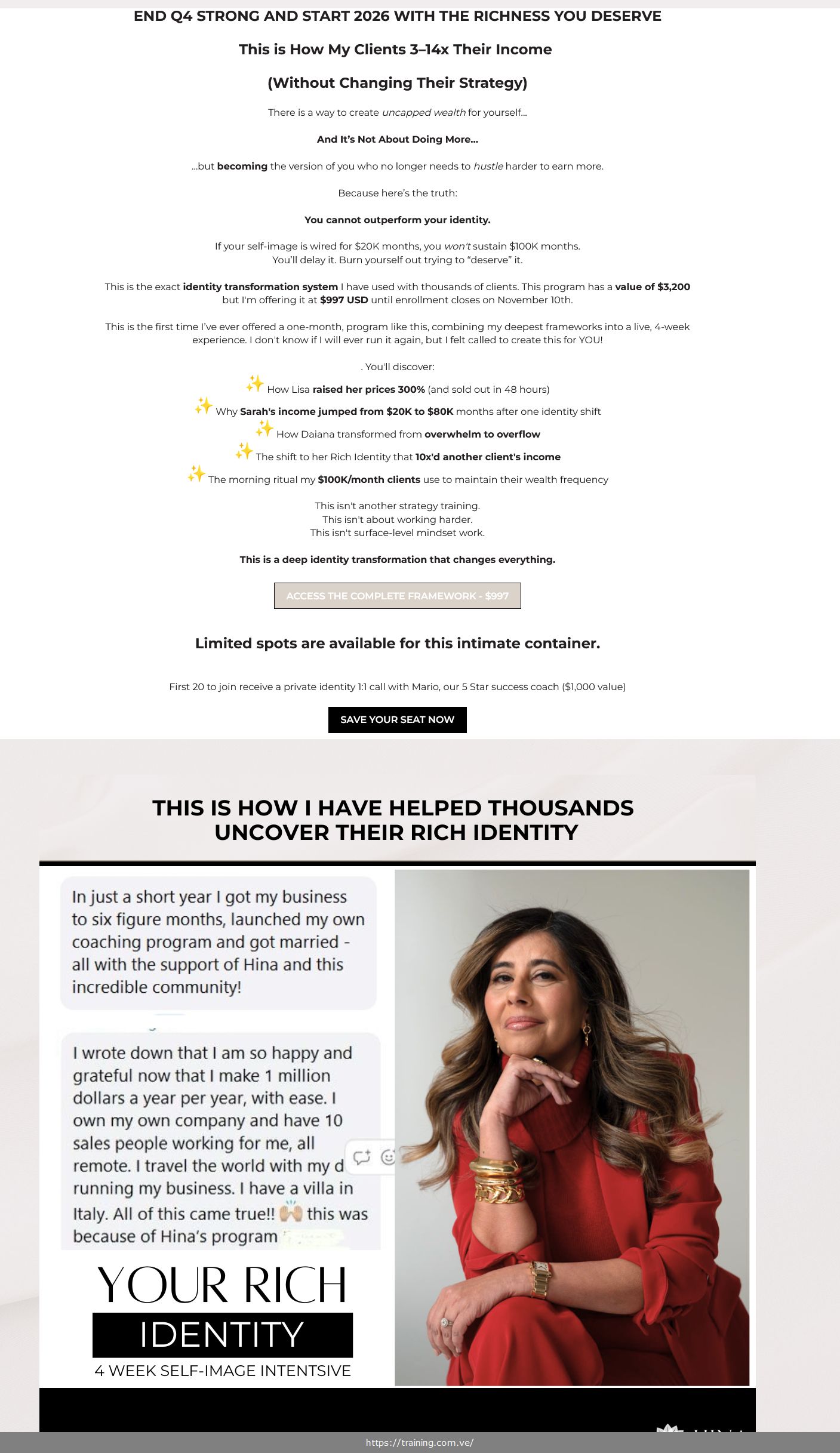 • The High-Earning Entrepreneur at a Plateau — Revenue is consistent and respectable, but a specific income ceiling keeps reappearing despite strategy changes, new offers, or increased effort. The program directly addresses the self-image pattern Hina Khan identifies as the cause: an identity wired for a specific income band that the subconscious treats as “normal,” triggering self-sabotage above it.