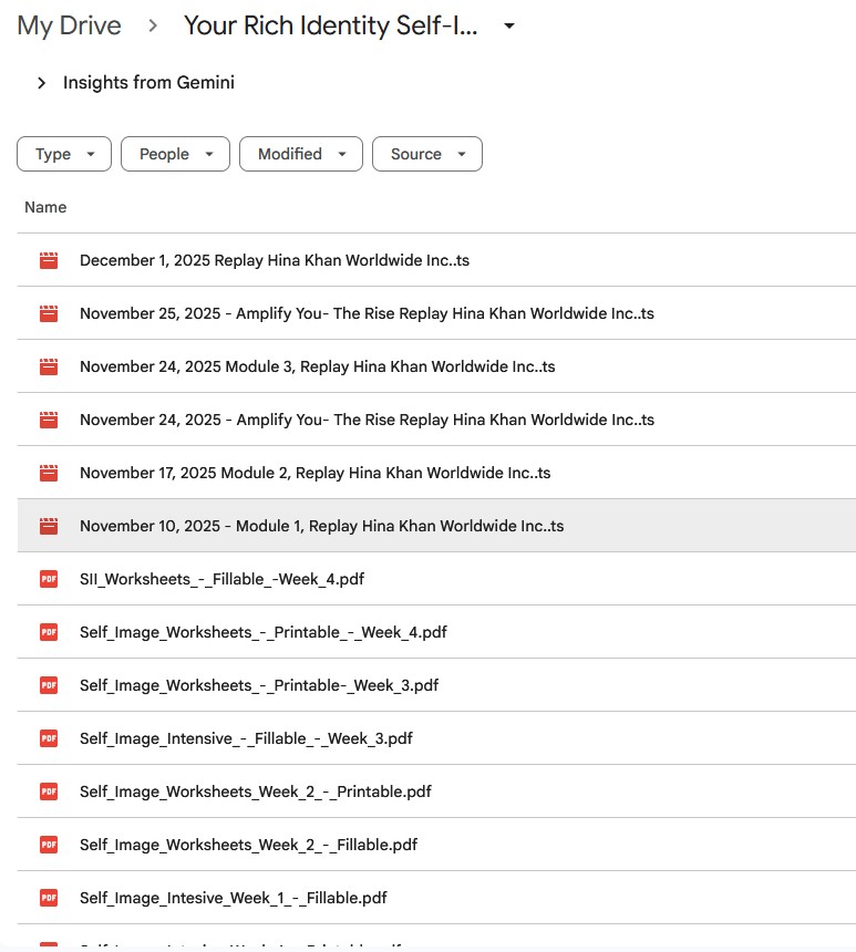 Your Rich Identity Self-Image Intensive is a 4-week recorded group coaching program by Hina Khan — former psychotherapist, best-selling author, and one of the top 1% of executive coaches certified by the Proctor Gallagher Institute. The program delivers Hina Khan's core identity transformation system, structured around four weekly live sessions focused on dissolving limiting self-image patterns and rebuilding wealth-aligned identity at the subconscious level. The complete download includes 6 session replays totaling 8 hours 9 minutes of video content, plus 8 fillable and printable PDF worksheets across all four weeks, packaged as 1.28 GB of learning material.